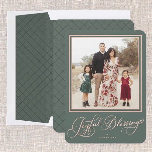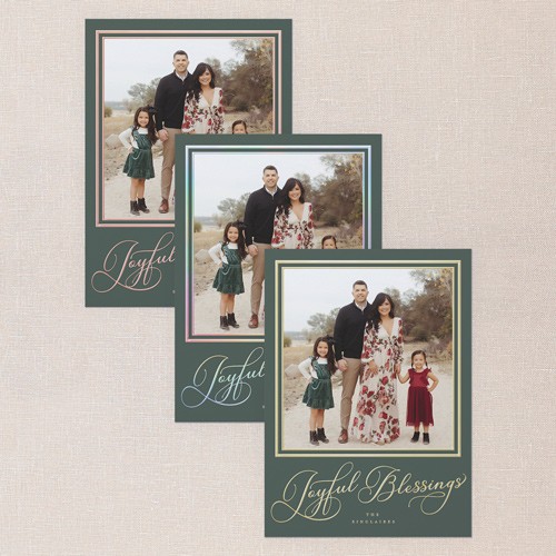 Share your favorite family moment with this classic holiday card. The design features elegant typography with your choice of greetings, including: Merry Christmas, Happy Holiday, or Joyful Blessings, paired with a full photo layout—perfect for letting one special picture shine. The border adds a timeless touch framing your photos, with options to adjust the background color to a rich green or soft gray, or click the color wheel icon to choose your own background color for a truly custom look. This personalized foil Christmas card lets you add your family name and greeting in real foil, available in gold foil, rose gold foil, and iridescent foil for an elegant touch. Sized at 5x7, it’s just right for sharing with friends and family near and far.