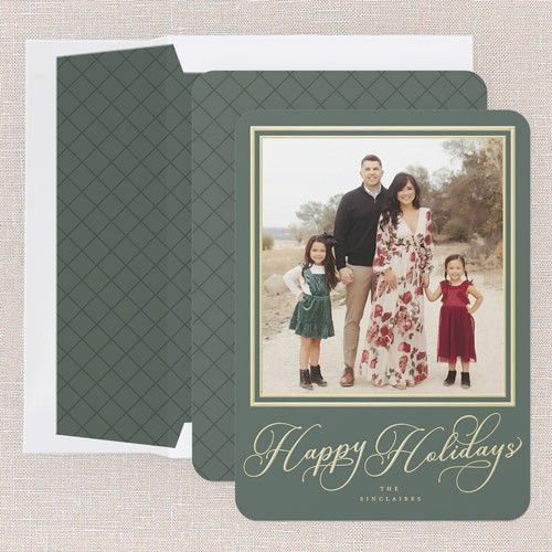 Share your favorite family moment with this classic holiday card. The design features elegant typography with your choice of greetings, including: Merry Christmas, Happy Holiday, or Joyful Blessings, paired with a full photo layout—perfect for letting one special picture shine. The border adds a timeless touch framing your photos, with options to adjust the background color to a rich green or soft gray, or click the color wheel icon to choose your own background color for a truly custom look. This personalized foil Christmas card lets you add your family name and greeting in real foil, available in gold foil, rose gold foil, and iridescent foil for an elegant touch. Sized at 5x7, it’s just right for sharing with friends and family near and far.