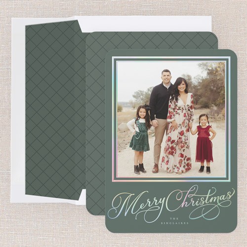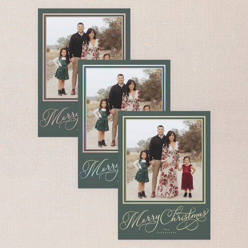 Share your favorite family moment with this classic holiday card. The design features elegant typography with your choice of greetings, including: Merry Christmas, Happy Holiday, or Joyful Blessings, paired with a full photo layout—perfect for letting one special picture shine. The border adds a timeless touch framing your photos, with options to adjust the background color to a rich green or soft gray, or click the color wheel icon to choose your own background color for a truly custom look. This personalized foil Christmas card lets you add your family name and greeting in real foil, available in gold foil, rose gold foil, and iridescent foil for an elegant touch. Sized at 5x7, it’s just right for sharing with friends and family near and far.