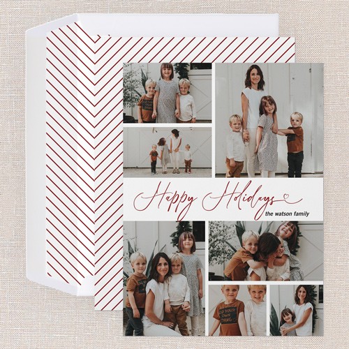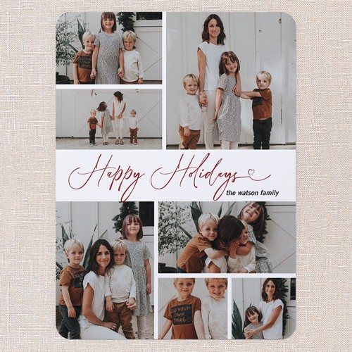 Share all your favorite moments with this classic multi photo holiday card. The design features a clean, timeless layout with space for up to seven photos—perfect for families who want to showcase a year’s worth of memories. Choose from the elegant greeting “Merry Christmas” or “Happy Holidays” and personalize the card by adding your family name. Select a crisp white background or click the color wheel icon to choose your own background color, making it easy to coordinate with your photos. This 6x8-sized Christmas card gives you plenty of room to add more pictures and a heartfelt message on the back. It’s a warm, personal way to connect with loved ones and share your story this season.