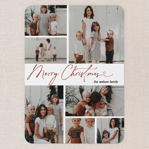 Share all your favorite moments with this classic multi photo holiday card. The design features a clean, timeless layout with space for up to seven photos—perfect for families who want to showcase a year’s worth of memories. Choose from the elegant greeting “Merry Christmas” or “Happy Holidays” and personalize the card by adding your family name. Select a crisp white background or click the color wheel icon to choose your own background color, making it easy to coordinate with your photos. This 6x8-sized Christmas card gives you plenty of room to add more pictures and a heartfelt message on the back. It’s a warm, personal way to connect with loved ones and share your story this season.