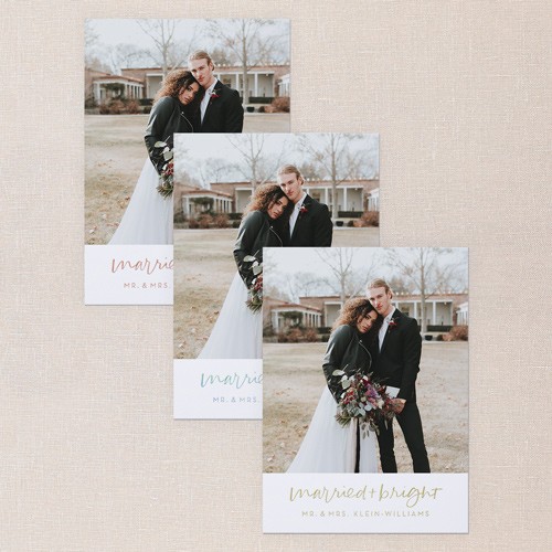 Celebrate your first holiday season as a married couple with this classic newlywed Christmas card. The design features a simple layout, perfect for showcasing your favorite wedding picture, with elegant “married & bright” lettering in real foil. Personalize your card with your names and greeting in your choice of gold foil, rose gold foil, or iridescent foil for a touch of sparkle. You can customize the background with a crisp white or click the color wheel icon to coordinate with your photo. This 5x7 holiday card is a warm way to share your joy and big day with friends and family. Make it truly yours by adding more photos or a heartfelt message on the back. Send a newlywed Christmas card that’s as special as your first year together.