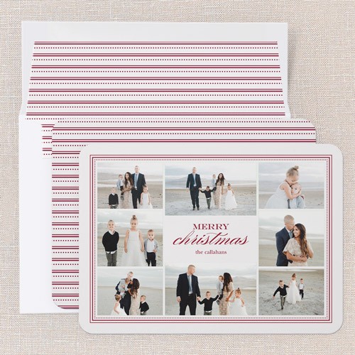 Share all your favorite moments with this classic holiday card. The timeless design features a clean border and elegant script for your “Merry Christmas" greeting in the middle, making it a beautiful choice for a Christmas card that feels both personal and polished. With a photo collage layout, you can showcase multiple family photos—perfect for sharing smiles, milestones, and memories from the year. The background is customizable, so you can choose from festive red, classic green, or click the color wheel icon for more background color options to match your photos. The greeting reads “Merry Christmas,” but you can personalize it to make it just right for your family and add your names for an extra personal touch. Sized at 5x7, this multi photo Christmas card gives you plenty of space to tell your story and connect with loved ones this holiday season.