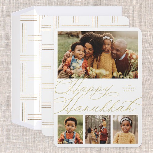 Celebrate the season with this classic holiday card, designed to showcase your favorite family moments. The elegant script greeting comes in your choice of: Merry Christmas, Happy Holidays, Blessed Christmas, Feliz Navidad, and Happy Hanukkah to align with your family traditions. With a multi photo layout, you can share even more memories this year with up to four photos, making it the perfect for families who love to tell their story. Choose from a deep blue, crisp white, or select your own background shade by clicking the color wheel. Add an elegant touch to your text with personalized foil details, available in gold foil, rose gold foil, or iridescent foil. Available in a 5x7 and size, add more photos and text on the back for free for even more customization., or iridescent foil. Available in a 6x8 and size