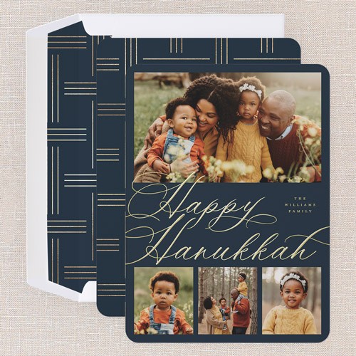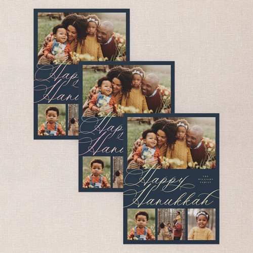 Celebrate the season with this classic holiday card, designed to showcase your favorite family moments. The elegant script greeting comes in your choice of: Merry Christmas, Happy Holidays, Blessed Christmas, Feliz Navidad, and Happy Hanukkah to align with your family traditions. With a multi photo layout, you can share even more memories this year with up to four photos, making it the perfect for families who love to tell their story. Choose from a deep blue, crisp white, or select your own background shade by clicking the color wheel. Add an elegant touch to your text with personalized foil details, available in gold foil, rose gold foil, or iridescent foil. Available in a 5x7 and size, add more photos and text on the back for free for even more customization., or iridescent foil. Available in a 6x8 and size