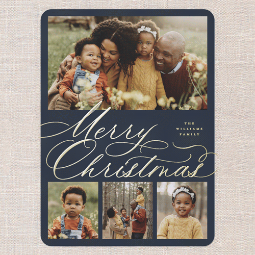 Celebrate the season with this classic holiday card, designed to showcase your favorite family moments. The elegant script greeting comes in your choice of: Merry Christmas, Happy Holidays, Blessed Christmas, Feliz Navidad, and Happy Hanukkah to align with your family traditions. With a multi photo layout, you can share even more memories this year with up to four photos, making it the perfect for families who love to tell their story. Choose from a deep blue, crisp white, or select your own background shade by clicking the color wheel. Add an elegant touch to your text with personalized foil details, available in gold foil, rose gold foil, or iridescent foil. Available in a 5x7 and size, add more photos and text on the back for free for even more customization., or iridescent foil. Available in a 6x8 and size