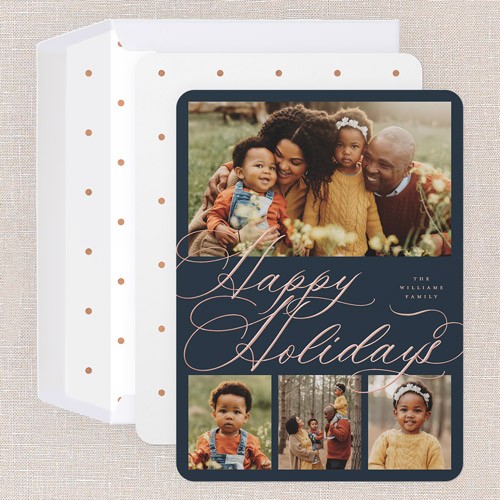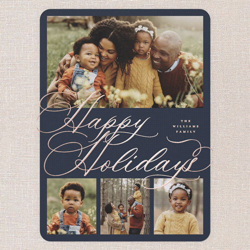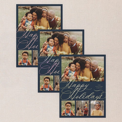 Celebrate the season with this classic holiday card, designed to showcase your favorite family moments. The elegant script greeting comes in your choice of: Merry Christmas, Happy Holidays, Blessed Christmas, Feliz Navidad, and Happy Hanukkah to align with your family traditions. With a multi photo layout, you can share even more memories this year with up to four photos, making it the perfect for families who love to tell their story. Choose from a deep blue, crisp white, or select your own background shade by clicking the color wheel. Add an elegant touch to your text with personalized foil details, available in gold foil, rose gold foil, or iridescent foil. Available in a 5x7 and size, add more photos and text on the back for free for even more customization., or iridescent foil. Available in a 6x8 and size