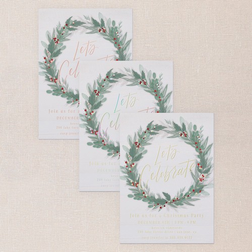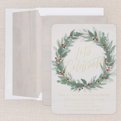 Invite friends and family to your holiday gathering with this rustic themed holiday card featuring a beautiful botanical watercolor wreath. This iconic Christmas design pops against any background—choose from a warm wood-tone brown, blue, beige, or red to match your preference. This non-photo Christmas card is perfect for those who love a classic look with a warm, personal touch. The greeting reads “Let's Celebrate” with space to add all your personal details to fit your celebration. For a little extra sparkle, personalize your card with real foil—available in gold foil, rose gold foil, or iridescent foil—making your holiday invitation shine. Sized at 5x7, this card is just right for sharing party details or heartfelt wishes for Christmas.