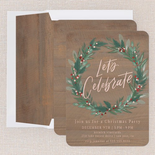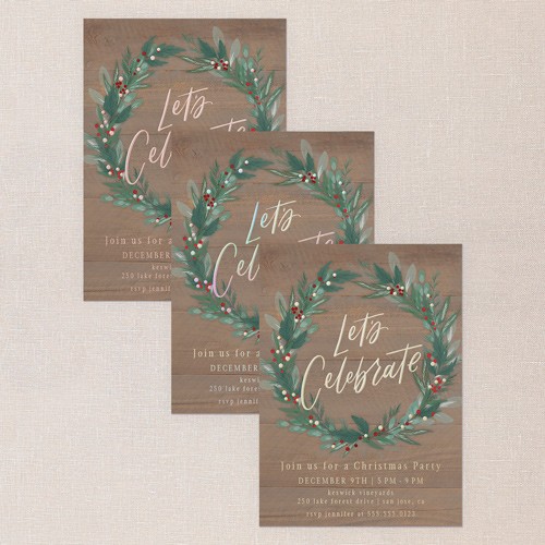 Invite friends and family to your holiday gathering with this rustic themed holiday card featuring a beautiful botanical watercolor wreath. This iconic Christmas design pops against any background—choose from a warm wood-tone brown, blue, beige, or red to match your preference. This non-photo Christmas card is perfect for those who love a classic look with a warm, personal touch. The greeting reads “Let's Celebrate” with space to add all your personal details to fit your celebration. For a little extra sparkle, personalize your card with real foil—available in gold foil, rose gold foil, or iridescent foil—making your holiday invitation shine. Sized at 5x7, this card is just right for sharing party details or heartfelt wishes for Christmas.