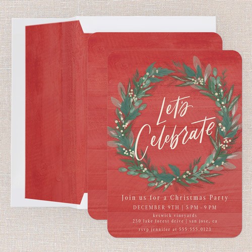 Invite friends and family to your holiday gathering with this rustic themed holiday card featuring a beautiful botanical watercolor wreath. This iconic Christmas design pops against any background—choose from a warm wood-tone brown, blue, beige, or red to match your preference. This non-photo Christmas card is perfect for those who love a classic look with a warm, personal touch. The greeting reads “Let's Celebrate” with space to add all your personal details to fit your celebration. For a little extra sparkle, personalize your card with real foil—available in gold foil, rose gold foil, or iridescent foil—making your holiday invitation shine. Sized at 5x7, this card is just right for sharing party details or heartfelt wishes for Christmas.