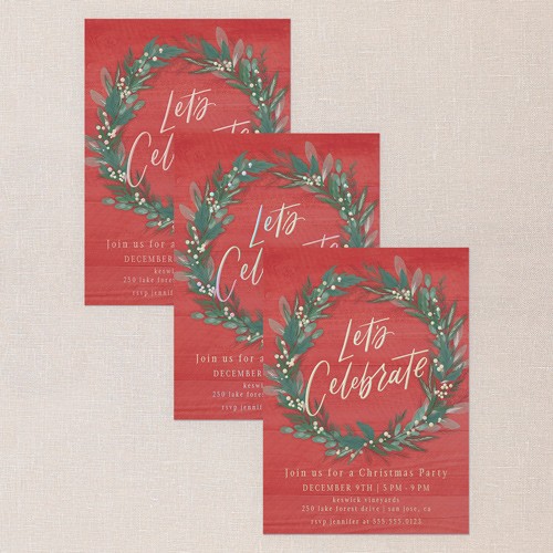 Invite friends and family to your holiday gathering with this rustic themed holiday card featuring a beautiful botanical watercolor wreath. This iconic Christmas design pops against any background—choose from a warm wood-tone brown, blue, beige, or red to match your preference. This non-photo Christmas card is perfect for those who love a classic look with a warm, personal touch. The greeting reads “Let's Celebrate” with space to add all your personal details to fit your celebration. For a little extra sparkle, personalize your card with real foil—available in gold foil, rose gold foil, or iridescent foil—making your holiday invitation shine. Sized at 5x7, this card is just right for sharing party details or heartfelt wishes for Christmas.