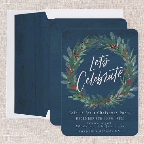 Invite friends and family to your holiday gathering with this rustic themed holiday card featuring a beautiful botanical watercolor wreath. This iconic Christmas design pops against any background—choose from a warm wood-tone brown, blue, beige, or red to match your preference. This non-photo Christmas card is perfect for those who love a classic look with a warm, personal touch. The greeting reads “Let's Celebrate” with space to add all your personal details to fit your celebration. For a little extra sparkle, personalize your card with real foil—available in gold foil, rose gold foil, or iridescent foil—making your holiday invitation shine. Sized at 5x7, this card is just right for sharing party details or heartfelt wishes for Christmas.