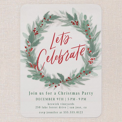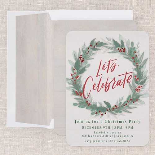Invite friends and family to your holiday gathering with this rustic themed holiday card featuring a beautiful botanical watercolor wreath. This iconic Christmas design pops against any background—choose from a warm wood-tone brown, blue, beige, or red to match your preference. This non-photo Christmas card is perfect for those who love a classic look with a warm, personal touch. The greeting reads “Let's Celebrate” with space to add all your personal details to fit your celebration. For a little extra sparkle, personalize your card with real foil—available in gold foil, rose gold foil, or iridescent foil—making your holiday invitation shine. Sized at 5x7, this card is just right for sharing party details or heartfelt wishes for Christmas.
