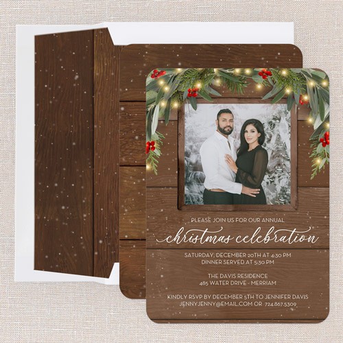 Invite loved ones to your annual celebration with this rustic holiday invitation card, featuring a natural wood-tone background and botanical greenery accented with festive red berries. The design brings a cozy, welcoming feel to your Christmas card, perfect for sharing your event details to celebrate the spirit of the season. You can personalize the card with your favorite photo, making it a one photo party invite that truly feels like yours. Choose between an earthy brown or holiday red background to match your style and photos. The elegant script greeting lets you customize with “Merry Christmas” or “Happy Holidays,” so your message fits just right. Sized at 5x7, there’s plenty of room for all your event details, and you can add more photos or text on the back for free. Send a holiday card that’s as inviting as your home—perfect for making your Christmas celebration extra special.