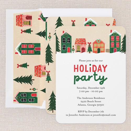 Invite friends and family to celebrate with this whimsical holiday card, featuring a row of charming, illustrated houses decked out for the season in a snowy setting. The iconic Christmas design brings a classic, cheerful vibe to your Christmas card, perfect for setting the tone for a festive gathering. The card’s crisp white background keeps things bright and modern, while playful pops of red and green add warmth and personality. This non-photo card is ideal for personalizing your party details, and you can customize the invite greeting to say Merry Christmas or Happy Holidays to match your vibe. Sized at 5x7, this card is easy to mail or hand out in person for a thoughtful way to spread holiday cheer. Whether you’re hosting a cozy get-together or a big bash, this traditional Christmas card is sure to make your invitation feel special and memorable.