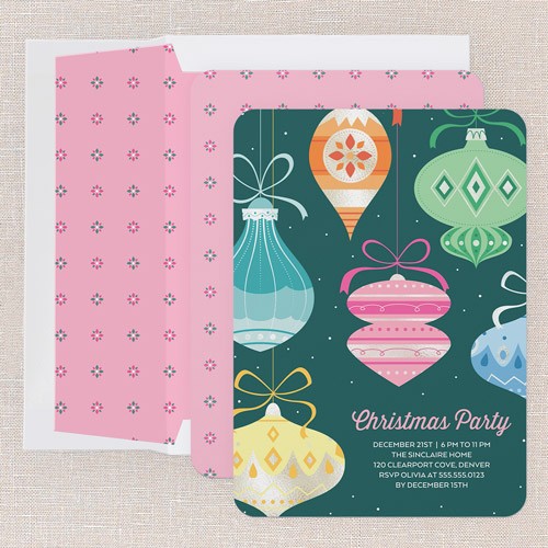 Invite friends and family to celebrate with this whimsical holiday card, featuring a playful array of iconic Christmas ornaments. The design pops with cheerful shades of pink, orange, blue, green, and more all set against your choice of a deep blue or crisp white background. This non-photo Christmas card is perfect for anyone who loves classic Christmas style with a fun, modern twist. The greeting reads “Christmas Party,” making it ideal to customize for your seasonal gatherings. Add your event details right on the front, so everything feels tailored to your celebration. Sized at 5x7, it’s easy to slip into an envelope and send out to loved ones. Whether you’re hosting a cozy get-together or a big bash, this traditional Christmas card brings a warm, inviting feel to your holiday invitations.
