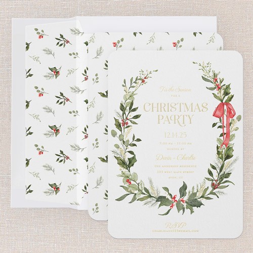Invite friends and family to celebrate with this classic holiday card. The botanical design features a beautiful watercolor wreath, accented with lush greenery and pops of red berries, finished with a festive red bow. This is a non-photo card, so all the focus is on your personalized party details, framed elegantly in the center. You can choose between a crisp white or sleek black background to match your style. This personalized foil Christmas card lets you add your greeting and text in real foil, available in gold foil, rose gold foil, or iridescent foil for a touch of shimmer. Sized at 5x7, it’s perfect for sending out holiday or Christmas party invitations that feel both timeless and warm. Make your holiday gathering extra special with a card that’s as inviting as your celebration.