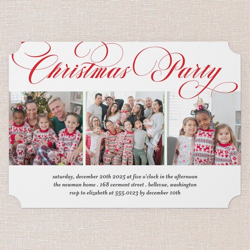 Invite loved ones to celebrate with this classic holiday card, perfect for your Christmas party. The design features elegant red script that reads “Christmas Party” or "Holiday Party,” depending on your preference, paired with a clean white background for a timeless look. Three photo slots let you share favorite moments, making this a multi photo Christmas card that feels personal and festive. The text is available in holiday red or you can click the color wheel icon to choose your own text color—great for coordinating with your party theme or photos. Sized at 5x7, this Christmas card is easy to personalize with event details and RSVP info. Send a holiday card that sets the tone for a joyful gathering.