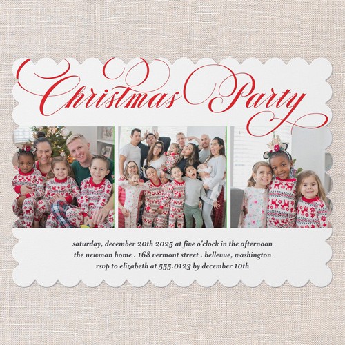 Invite loved ones to celebrate with this classic holiday card, perfect for your Christmas party. The design features elegant red script that reads “Christmas Party” or "Holiday Party,” depending on your preference, paired with a clean white background for a timeless look. Three photo slots let you share favorite moments, making this a multi photo Christmas card that feels personal and festive. The text is available in holiday red or you can click the color wheel icon to choose your own text color—great for coordinating with your party theme or photos. Sized at 5x7, this Christmas card is easy to personalize with event details and RSVP info. Send a holiday card that sets the tone for a joyful gathering.