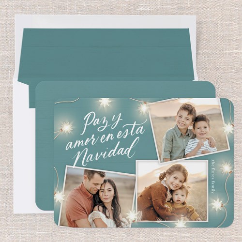 Share the warmth of the season with this rustic holiday card, designed to bring a personal touch to your Christmas greetings. The elegant script greeting, “Paz y amor en esta Navidad,” adds a heartfelt, bilingual touch for Feliz Navidad wishes. The card features cheerful holiday stringed lights framing your photos against your choice of a cozy beige, holiday red, or cool blue background to match your style. The multi photo Christmas card layout lets you showcase three special moments, making it perfect for families who want to share more memories. Sized at 5x7, this holiday card is easy to customize and makes a thoughtful keepsake for friends and loved ones.
