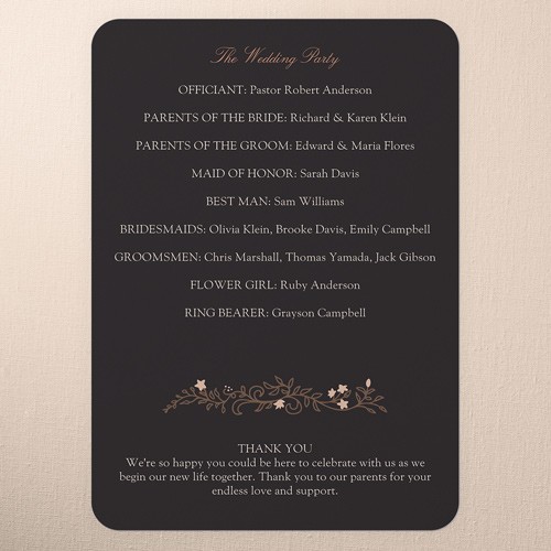 Share all the details of your big day with a personalized program that's sure to impress your, guests. It's the perfect way to make them feel more a part of the ceremony. Select a program, that coordinates with your invitations, RSVP cards, place cards and more.
