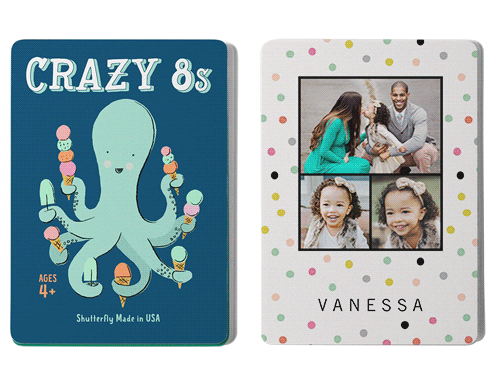 Make game time extra fun with personalized card games, available in the classic children's games Go Fish and Crazy 8s. The cards can be personalized with photos and text on one side and feature whimsical illustrations on the other. Both games provide a fun and educational way for children to learn their numbers, work on strategy, and decision-making skills. Great for home play or use in the classroom. Treat the special kids in your life to a one-of-a-kind gift.