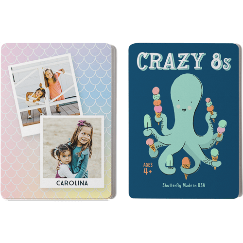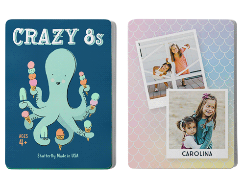 Make game time extra fun with personalized card games, available in the classic children's games Go Fish and Crazy 8s. The cards can be personalized with photos and text on one side and feature whimsical illustrations on the other. Both games provide a fun and educational way for children to learn their numbers, work on strategy, and decision-making skills. Great for home play or use in the classroom. Treat the special kids in your life to a one-of-a-kind gift.