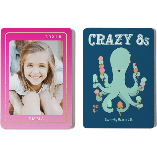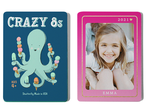 Make game time extra fun with personalized card games, available in the classic children's games Go Fish and Crazy 8s. The cards can be personalized with photos and text on one side and feature whimsical illustrations on the other. Both games provide a fun and educational way for children to learn their numbers, work on strategy, and decision-making skills. Great for home play or use in the classroom. Treat the special kids in your life to a one-of-a-kind gift.