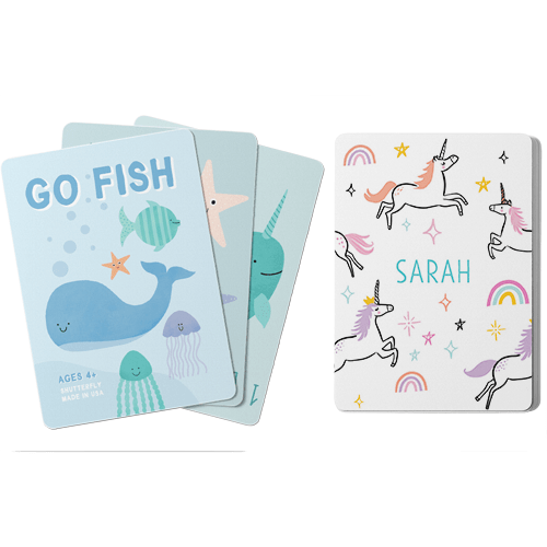 Make game time extra fun with personalized card games, available in the classic children's games Go Fish and Crazy 8s. The cards can be personalized with photos and text on one side and feature whimsical illustrations on the other. Both games provide a fun and educational way for children to learn their numbers, work on strategy, and decision-making skills. Great for home play or use in the classroom. Treat the special kids in your life to a one-of-a-kind gift.