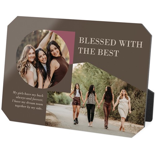 Showcase favorite photos and turn any space into a happy place with desktop plaques. Choose from different shapes, stylish backgrounds, and layouts for one or more photos for a unique look. Plaques include a built-in easel for horizontal or vertical display.