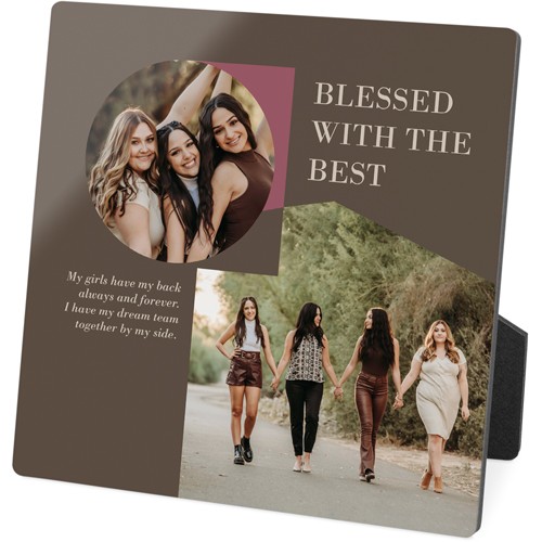 Showcase favorite photos and turn any space into a happy place with desktop plaques. Choose from different shapes, stylish backgrounds, and layouts for one or more photos for a unique look. Plaques include a built-in easel for horizontal or vertical display.