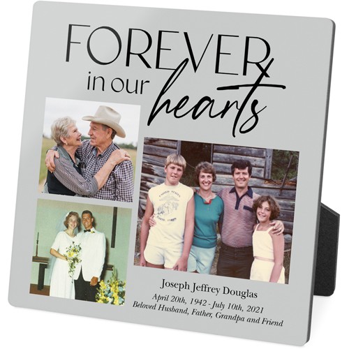 Showcase favorite photos and turn any space into a happy place with desktop plaques. Choose from different shapes, stylish backgrounds, and layouts for one or more photos for a unique look. Plaques include a built-in easel for horizontal or vertical display.
