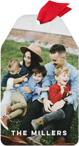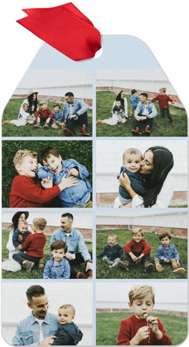 Celebrate your favorite moments with this traditional metal Christmas ornament, featuring a clean, modern layout with space for up to eight cherished family photos. Crafted from durable, high-quality coated aluminum, this personalized Christmas ornament is lightweight yet sturdy, and your photos print in crisp, vibrant color. The ornament is printed on both sides, so you can add even more photos on the back, plus your family name, the year, or a heartfelt message. Each custom photo ornament comes in a soft storage pouch and hangs from the tree with a festive red ribbon. Photo ornaments are a lovely way to add to your ornament collection or give as thoughtful gifts.