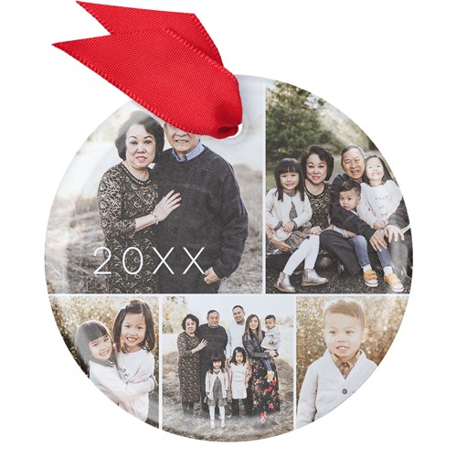Showcase your favorite family moments with this classic glass photo ornament. The design features a clean, modern collage layout that lets you display multiple photos, so everyone gets a spot on the tree. Made from real, slightly frosted glass, this personalized Christmas ornament beautifully reflects twinkling holiday lights, making your memories shine even brighter. You can add the year or your family name to create a truly custom Christmas ornament that’s unique to your crew. Available in three shapes—square, circle, and hexagon—this custom photo ornament comes in a soft storage pouch and hangs from the tree with a festive red ribbon. Christmas photo ornaments are a wonderful way to add to your ornament collection, capturing the special little moments that made your year. They also make thoughtful gifts for loved ones or a sweet way to commemorate this holiday season.