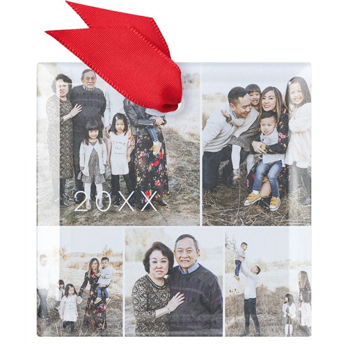 Showcase your favorite family moments with this classic glass photo ornament. The design features a clean, modern collage layout that lets you display multiple photos, so everyone gets a spot on the tree. Made from real, slightly frosted glass, this personalized Christmas ornament beautifully reflects twinkling holiday lights, making your memories shine even brighter. You can add the year or your family name to create a truly custom Christmas ornament that’s unique to your crew. Available in three shapes—square, circle, and hexagon—this custom photo ornament comes in a soft storage pouch and hangs from the tree with a festive red ribbon. Christmas photo ornaments are a wonderful way to add to your ornament collection, capturing the special little moments that made your year. They also make thoughtful gifts for loved ones or a sweet way to commemorate this holiday season.