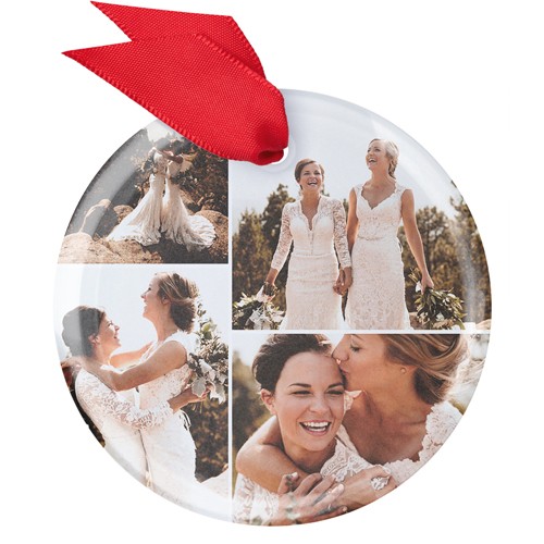 Celebrate your first holiday season as a married couple with this elegant glass photo ornament. The design features a classic square shape, beautifully showcasing four of your favorite wedding moments in crisp, vibrant color. Made from real, slightly frosted glass, this custom wedding Christmas ornament reflects twinkling lights on your tree, adding a touch of magic to your decor. Personalize it with your names or the year to create a truly unique Christmas ornament you’ll cherish for years to come. Available in three shapes—square, circle, and hexagon—these photo ornaments are a wonderful way to display your love story and add to your ornament collection. Each customized Christmas ornament comes in a soft storage pouch and hangs from the tree with a festive red ribbon, making it a thoughtful gift or keepsake for newlyweds.