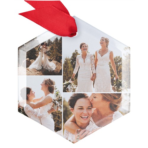 Celebrate your first holiday season as a married couple with this elegant glass photo ornament. The design features a classic square shape, beautifully showcasing four of your favorite wedding moments in crisp, vibrant color. Made from real, slightly frosted glass, this custom wedding Christmas ornament reflects twinkling lights on your tree, adding a touch of magic to your decor. Personalize it with your names or the year to create a truly unique Christmas ornament you’ll cherish for years to come. Available in three shapes—square, circle, and hexagon—these photo ornaments are a wonderful way to display your love story and add to your ornament collection. Each customized Christmas ornament comes in a soft storage pouch and hangs from the tree with a festive red ribbon, making it a thoughtful gift or keepsake for newlyweds.