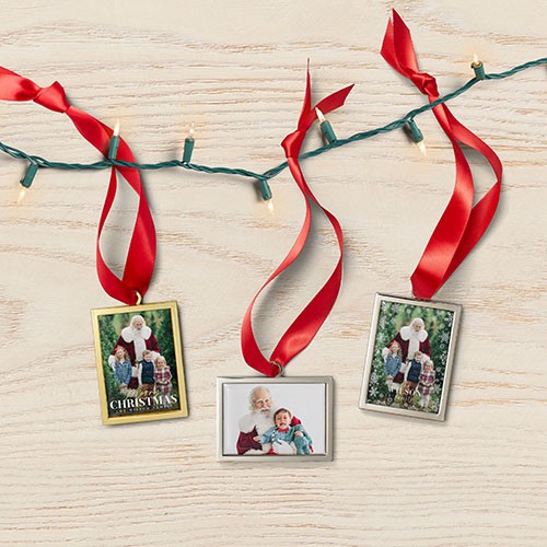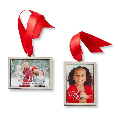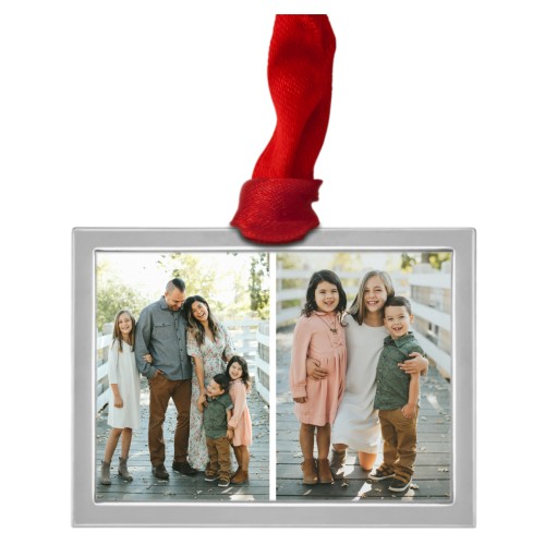 Showcase your favorite family moments with this luxe frame ornament. The sleek frame beautifully displays two cherished images side by side. Available in both gold and silver shades, this photo frame ornament adds a touch of elegance to your holiday decor. Personalize it with your family name, the year, or a heartfelt message to make it truly yours. Each customized Christmas ornament comes in a soft storage pouch and hangs from the tree with a festive red ribbon. Luxe photo ornaments are a wonderful way to add to your ornament collection, capturing the special little moments that made your year. They also make thoughtful gifts for loved ones or keepsakes to enjoy year after year.