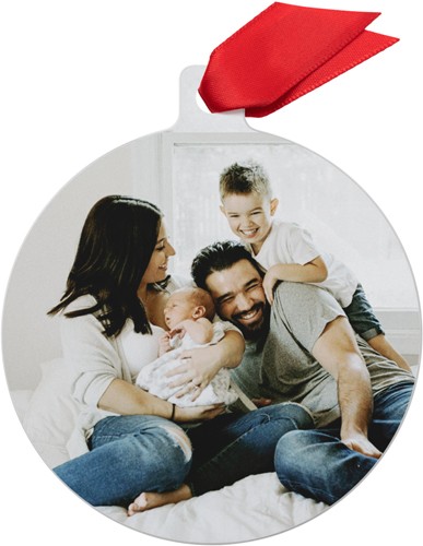 Celebrate the season this traditional metal Christmas ornament, featuring a collage-style layout that beautifully showcases three favorite photos. The crisp, vibrant images are printed on both sides, so you can add even more memories to the back. Crafted from durable, high-quality coated aluminum, this personalized Christmas ornament is designed to last for years to come. Customize it with your family name, the year, or a heartfelt message to make it truly unique. Available in four shapes—square, circle, rectangle bracket, and gift tag—this custom photo ornament comes in a soft storage pouch and hangs from the tree with a festive red ribbon. Photo ornaments are a wonderful way to add to your ornament collection, capturing the special little moments that made your year. They also make thoughtful gifts or reusable present gift tags for loved ones.