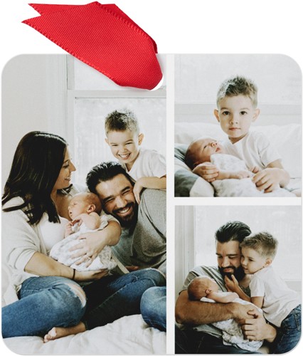 Celebrate the season this traditional metal Christmas ornament, featuring a collage-style layout that beautifully showcases three favorite photos. The crisp, vibrant images are printed on both sides, so you can add even more memories to the back. Crafted from durable, high-quality coated aluminum, this personalized Christmas ornament is designed to last for years to come. Customize it with your family name, the year, or a heartfelt message to make it truly unique. Available in four shapes—square, circle, rectangle bracket, and gift tag—this custom photo ornament comes in a soft storage pouch and hangs from the tree with a festive red ribbon. Photo ornaments are a wonderful way to add to your ornament collection, capturing the special little moments that made your year. They also make thoughtful gifts or reusable present gift tags for loved ones.