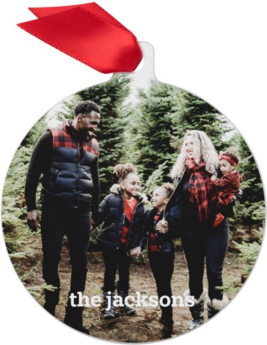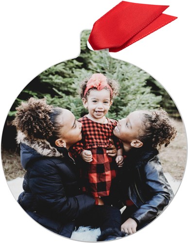 This traditional metal Christmas ornament features your favorite photo front and center, and feels timeless on the tree. The design is simple and elegant, letting your family’s smiling faces shine—perfect for capturing those cozy holiday moments. Made from durable, high-quality coated aluminum, this personalized Christmas ornament is lightweight yet sturdy, and it’s printed on both sides so you can add another photo or a special message on the back. You can customize the text by adding your family name or the year to make it truly yours. Available in four shapes—circle, square, rectangle bracket, and gift tag—these custom photo ornaments are a wonderful way to add to your ornament collection and celebrate the memories that made your year. Each ornament comes in a soft storage pouch and hangs with a festive red ribbon, ready to become a cherished part of your holiday tradition.