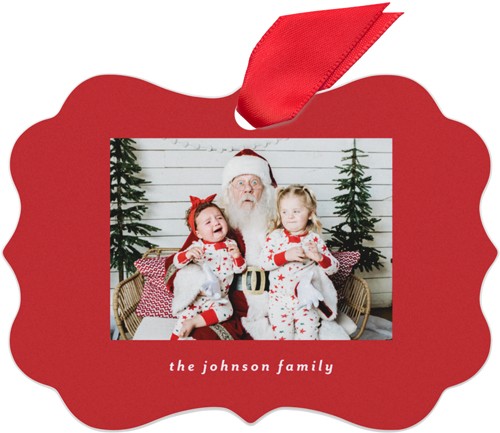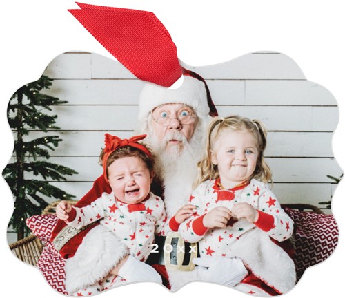 Bring a touch of tradition to your holiday décor with this personalized metal Christmas ornament. This versatile design features a full-bleed photo space so your favorite memories shine, with the year marked in subtle type at the bottom. Crafted from durable, high-quality coated aluminum, this custom Christmas ornament is printed on both sides, so you can add another favorite photo or a special message on the back. Available in four shapes—square, circle, rectangle bracket, and gift tag—these unique Christmas ornaments are perfect for adding to your ornament collection or giving as thoughtful gifts. Each ornament comes in a soft storage pouch and hangs from the tree with a bright red ribbon. Photo ornaments like this are a wonderful way to capture the special little moments that made your year.