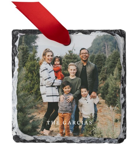 This elegant, personalized slate ornament will be a one-of-a-kind addition to any tree. Made of natural stone, no two ornaments will be exactly alike. Available in round or square, the ornaments are personalized on one side and come with a red ribbon. Customize with a photo, monogram and more for the perfect gift for family, friends, teachers and colleagues.