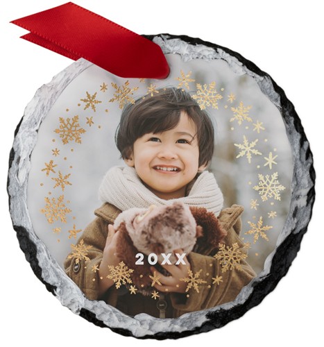 This elegant, personalized slate ornament will be a one-of-a-kind addition to any tree. Made of natural stone, no two ornaments will be exactly alike. Available in round or square, the ornaments are personalized on one side and come with a red ribbon. Customize with a photo, monogram and more for the perfect gift for family, friends, teachers and colleagues.