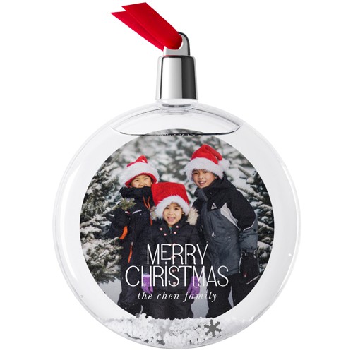 Embrace the magic of the holiday season by bringing cherished memories to life in your own custom snow globe, complete with swirling white snow and silver snowflakes. This mesmerizing liquid-filled tree ornament lets you festively showcase favorite photos, transforming special moments into whimsical wintertime scenes. With the option to personalize with a loved one’s name or a heartfelt holiday message, this ornament makes a delightful keepsake to commemorate special occasions or a truly one-of-a-kind gift they’ll treasure forever.