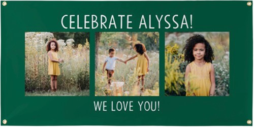 Use this vinyl banner to share news with your neighbors, from celebrating a graduate, a wedding or sports team to spreading the news about an event. Personalize on one side with your choice of horizontal or vertical designs, and hang using the four gold grommets at the corners. No hanging accessories included.