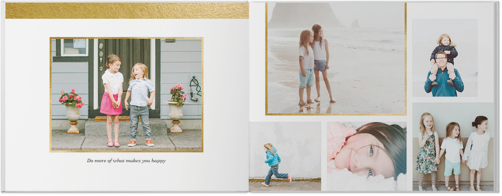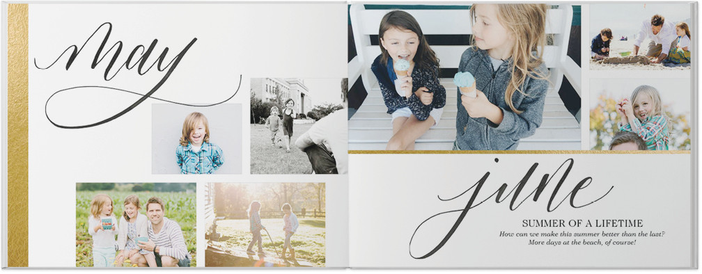 Relive your year's most memorable moments with this classically beautiful custom photo book. Hand-written embellishments let you organize your story by month, while photo-focused layouts let your pictures come to life. Add a touch of shimmer with simple gold faux foil pattern bands. Endless possibilities - all layouts, embellishments, text and elements are fully customizable.