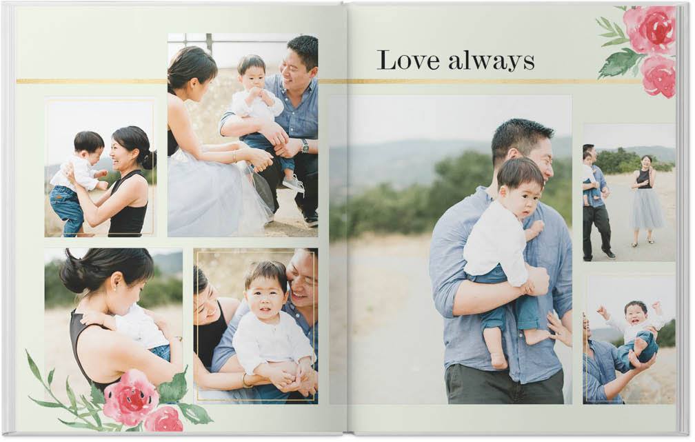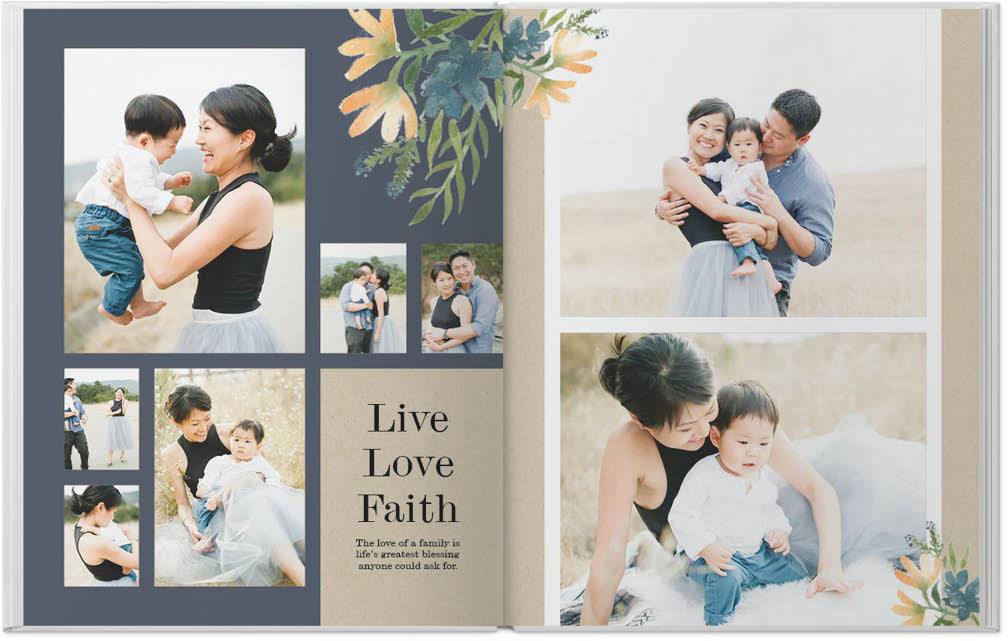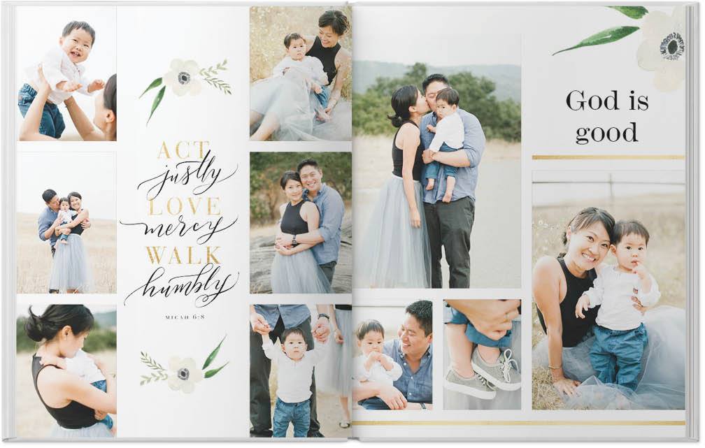 This beautiful faith-based custom photo book combines hand-painted flowers with heartfelt, inspirational verses. Delicate faux gold frames stand out against soft, muted backgrounds, while scripture centered around love and family lift your spirit and deepen your faith. Endless possibilities - all layouts, embellishments, text and elements are fully customizable. This photo book is from our Designer Collection created by Potts Design.