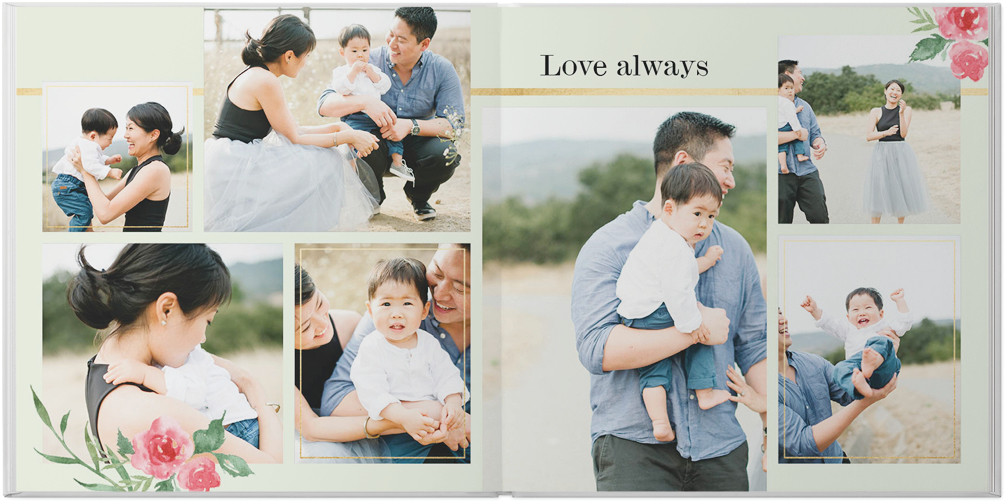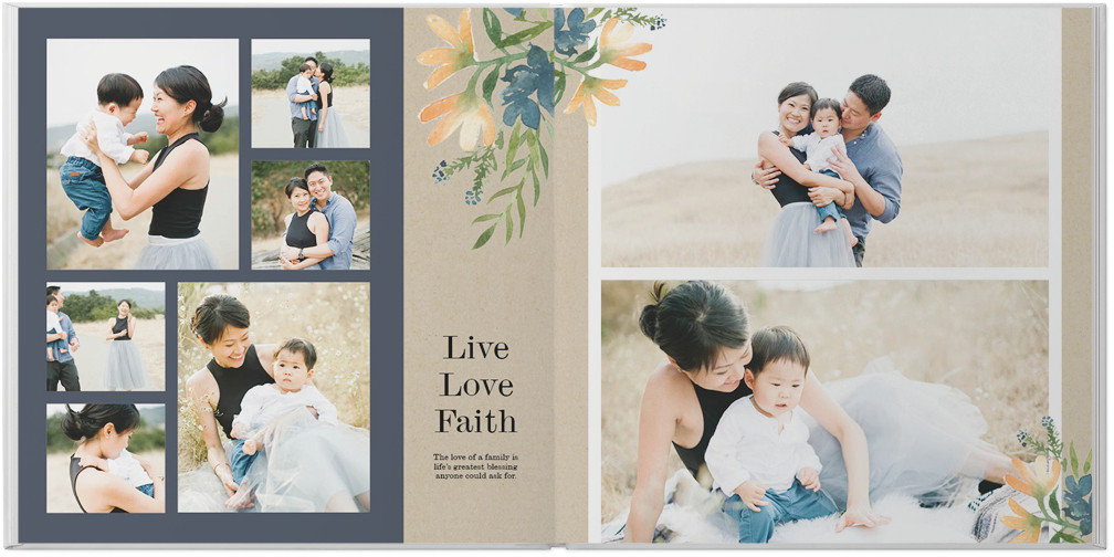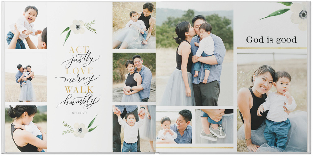 This beautiful faith-based custom photo book combines hand-painted flowers with heartfelt, inspirational verses. Delicate faux gold frames stand out against soft, muted backgrounds, while scripture centered around love and family lift your spirit and deepen your faith. Endless possibilities - all layouts, embellishments, text and elements are fully customizable. This photo book is from our Designer Collection created by Potts Design.