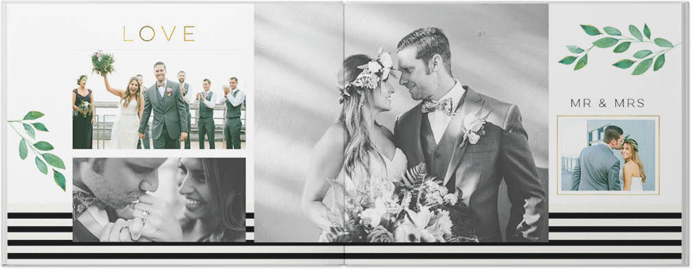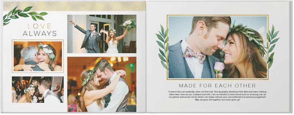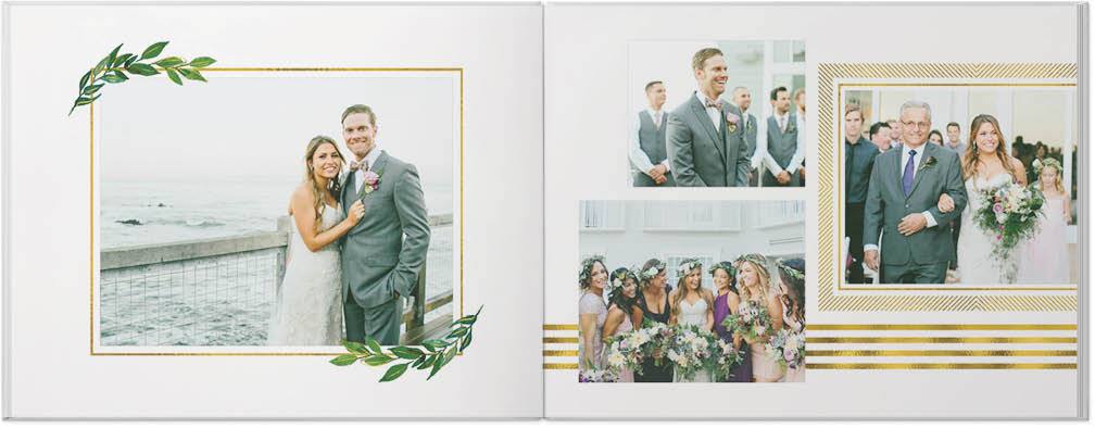 From that first look to the last dance, when it comes to your big day, let no detail go uncaptured. Hold on to the magic of it all with this elegant custom photo book. Stylishly simplistic layouts paired with enchanting touches of gold and foliage bring your memories into focus. Endless possibilities - all layouts, embellishments, text and elements are fully customizable.